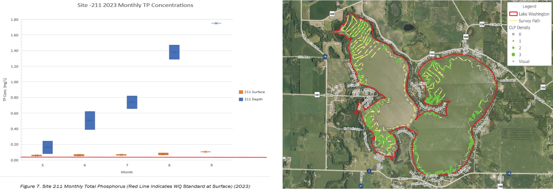 Water quality monitoring and sampling are tailored to lake morphology, hydrologic connectivity, and project goals. Monitoring programs are designed to capture seasonal and interannual variability in physical, chemical, and biological parameters. For Lake Washington in southern Minnesota, ISG coordinated monitoring at in‑lake stations, tributary inlets, and the lake outlet to characterize nutrient behavior across the lake‑watershed system to synthesize historical data, watershed studies, and regulatory frameworks into a comprehensive management plan with defined nutrient reduction targets, building a dataset across multiple years at the same sites.