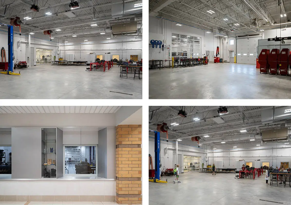 Fairmont Area Schools partnered with ISG’s design team to bolster their high school’s CTE program. Improvements included designing two new typical lab style classrooms and introducing an HVAC training shop, bringing college-level CTE credits into the school’s curriculum. A woodshop and large construction area were also designed. A uniquely outfitted hangar door, large enough to move a house out of the building, supports students working with Habitat for Humanity on large projects. To address other school safety needs, a storm shelter was incorporated into the construction area and shop spaces.