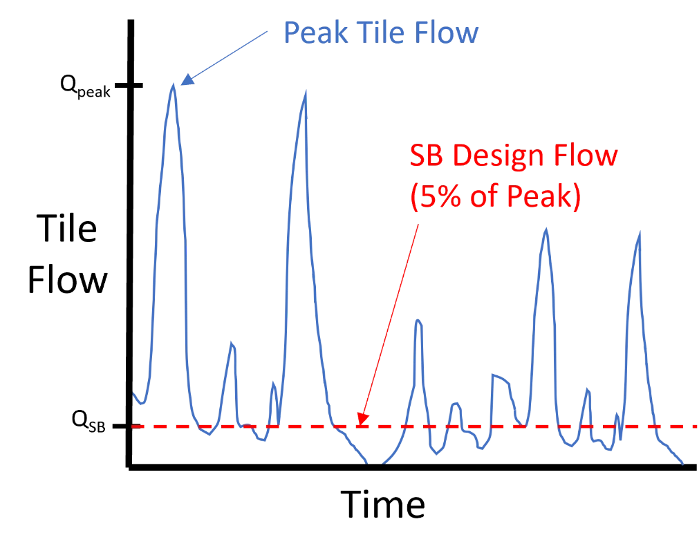 Drainage system capacity refers to the maximum or peak flowrate expected from the main tile based on the drainage system characteristics. The idea behind this criterion is that treating a certain percentage of the peak drainage system flow should result in capture and treatment of a sufficient percentage of the total annual drainage flow.