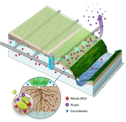 By dispersing a portion of the tile flow through a riparian buffer, soil microbes convert nitrate into atmospheric nitrogen gas (Figure 1).