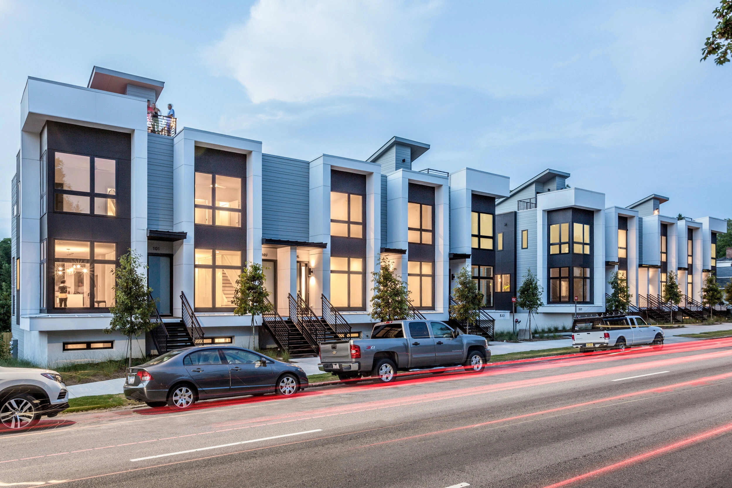 Providing a modern touch to a historical area of downtown Raleigh, 10 Arros is a group of townhomes featuring open floor plans, 10-foot ceilings, and vast glass windows. ISG implemented an innovative approach to row house communities by designing townhomes with sleek finishes, private garages, and rooftop terraces with skyline views.