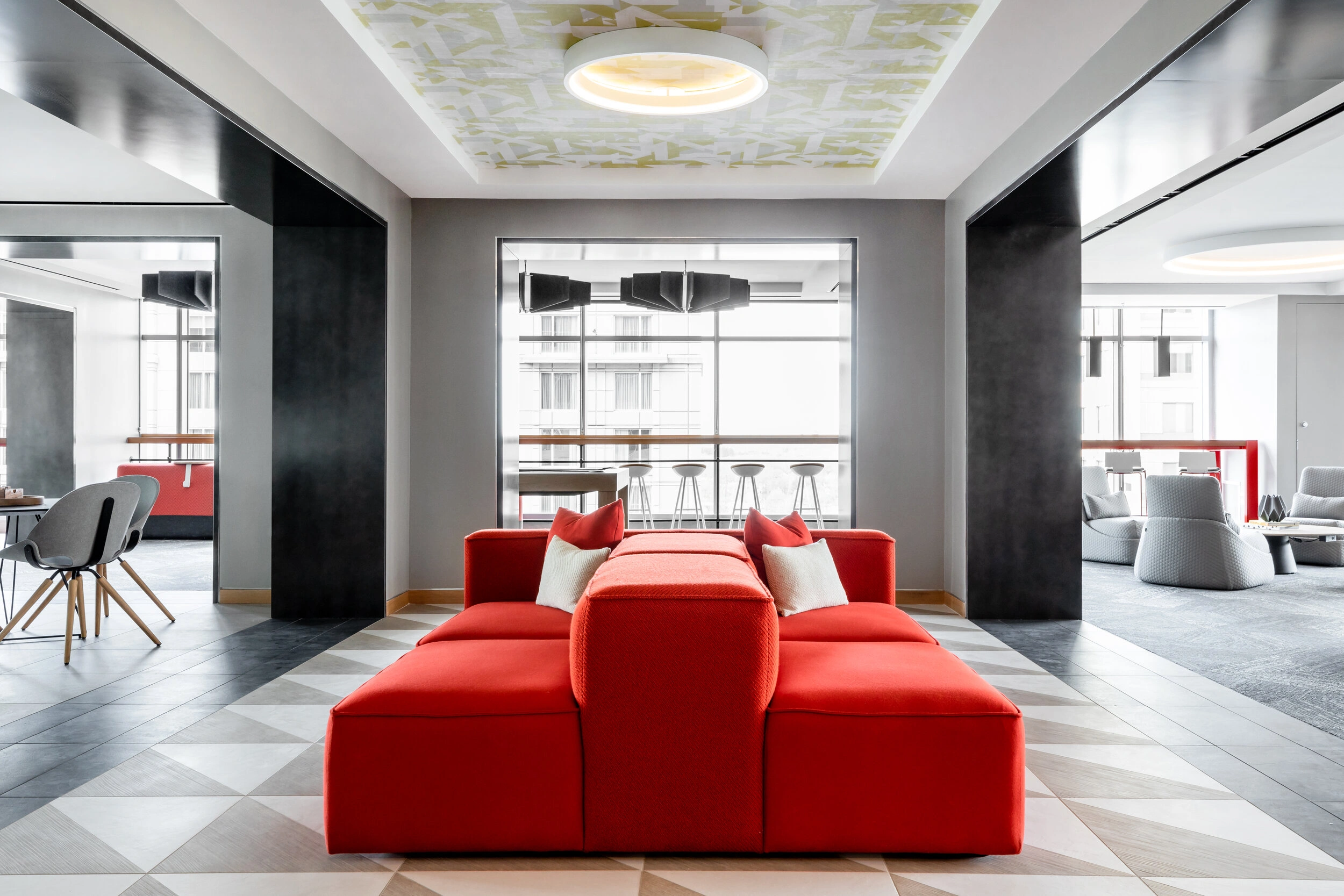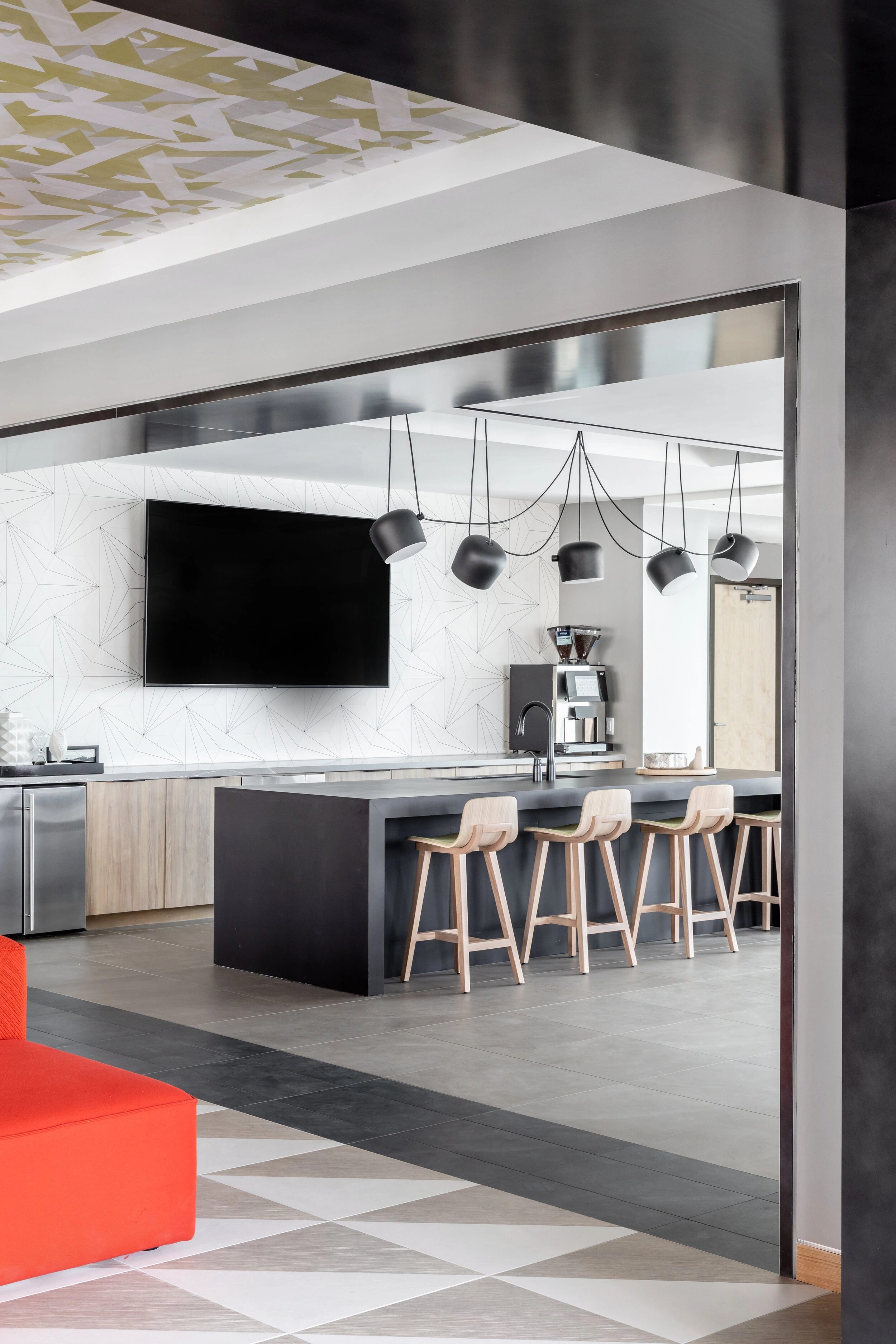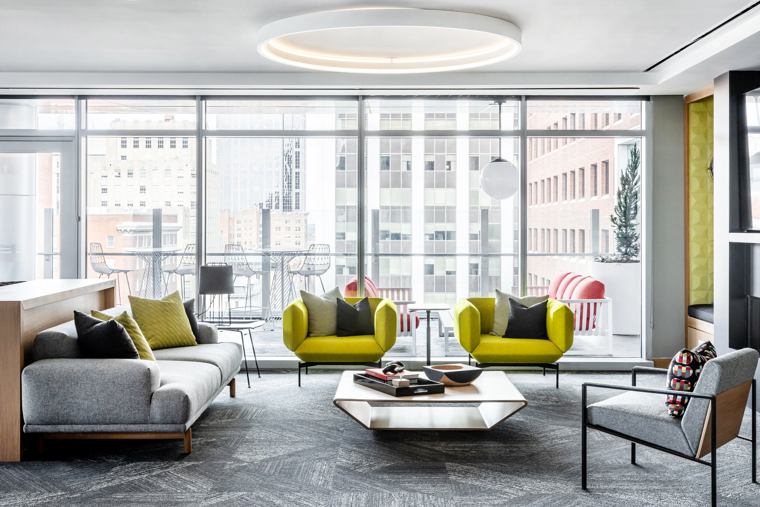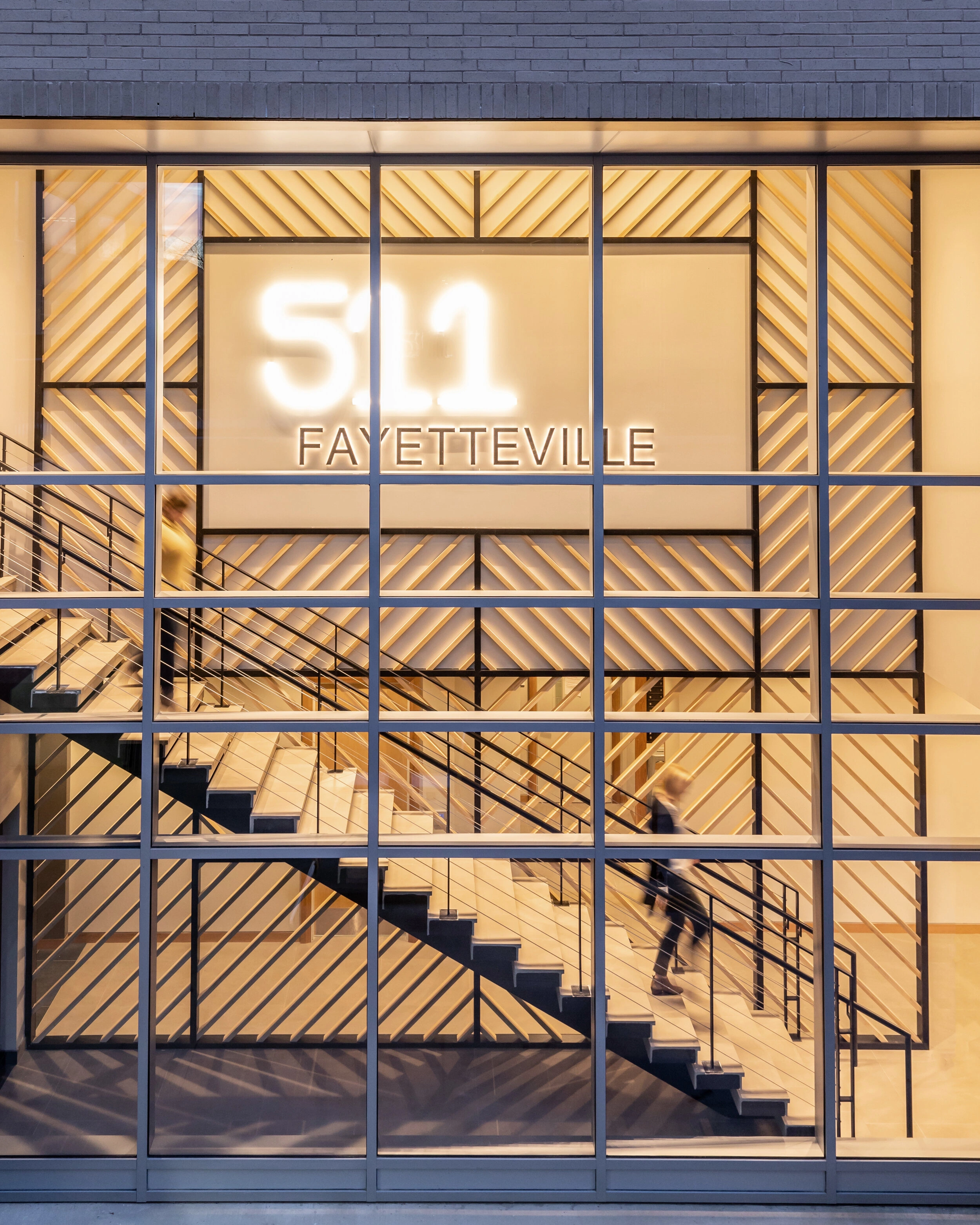 511 Faye is a high-rise luxury apartment community located in FNB Tower in downtown Raleigh, North Carolina. Highlighting the Raleigh skyline and embodying downtown living, the interior of 511 Faye features sleek angles and energetic colors, patterns, and textures to promote a welcoming and dynamic space for residents. The amenities are just as luxurious, featuring a fitness center, yoga studio, and a skydeck with a pool.