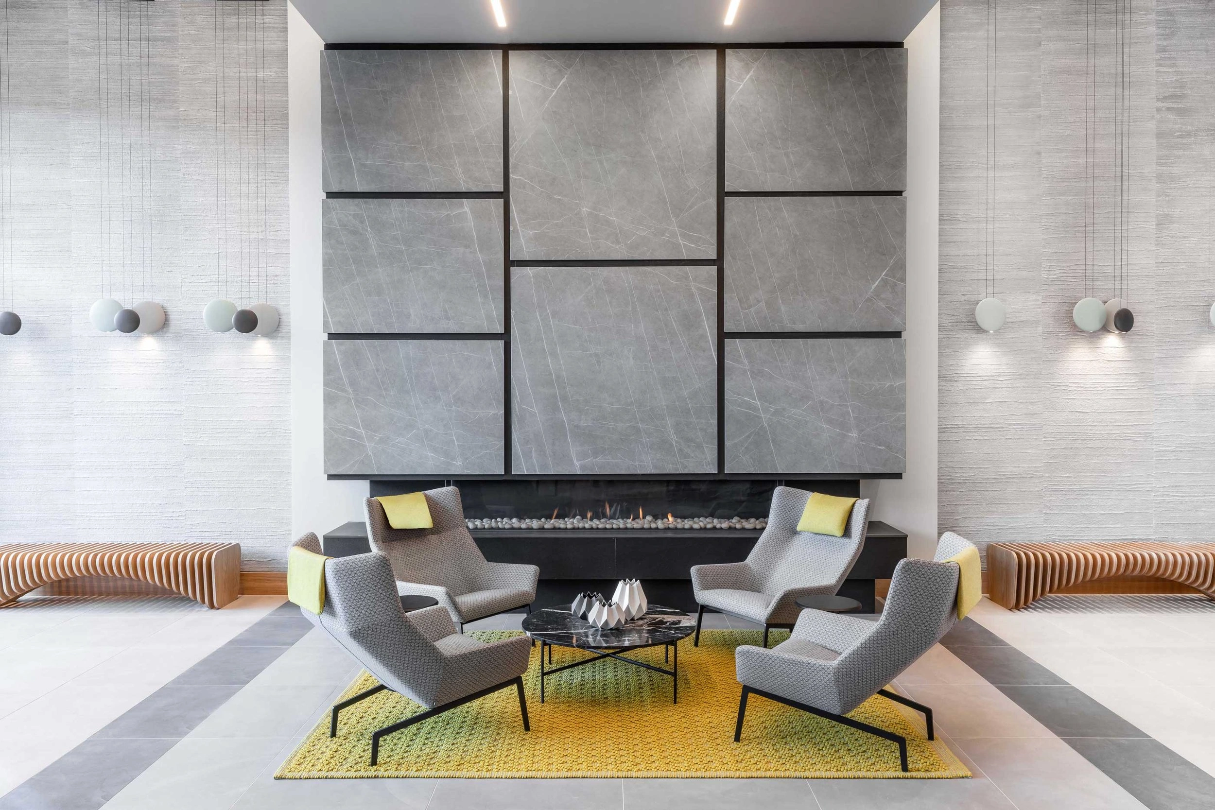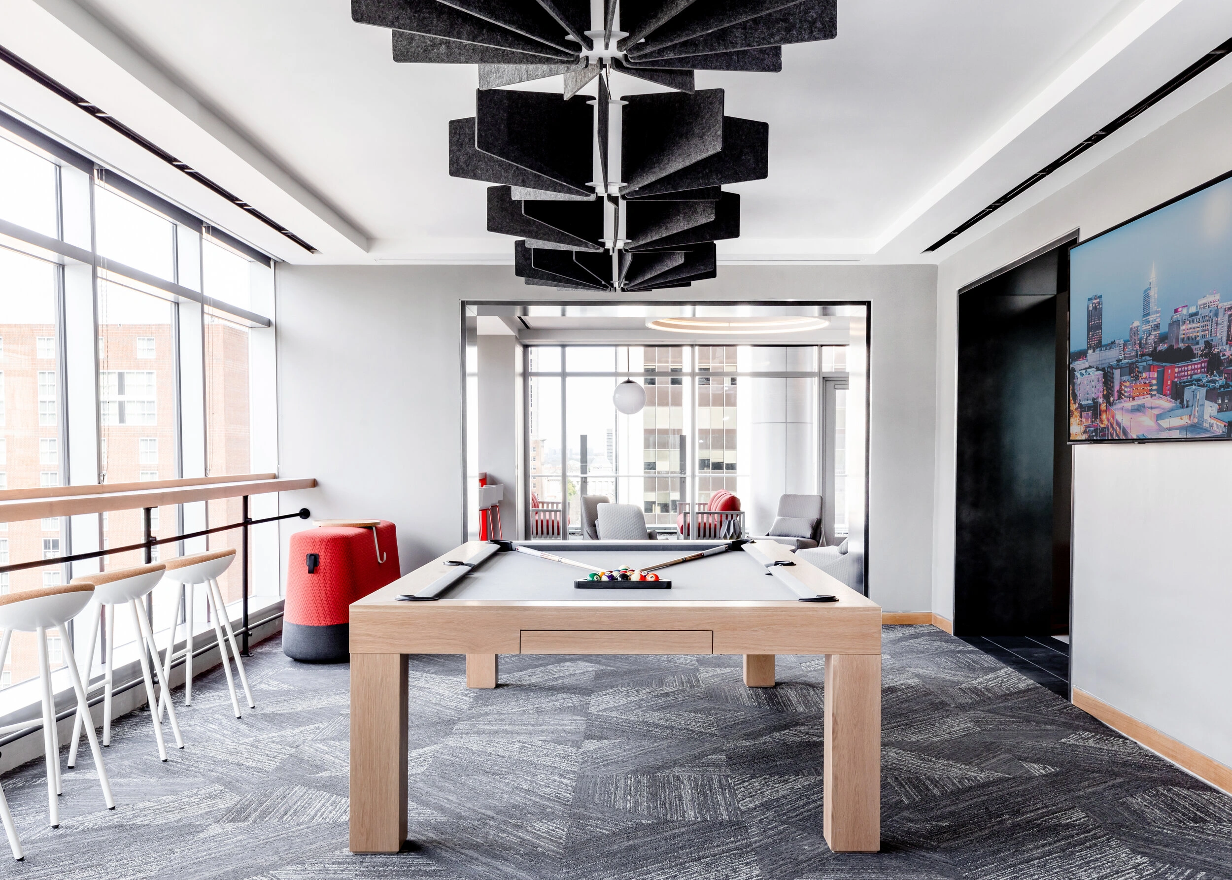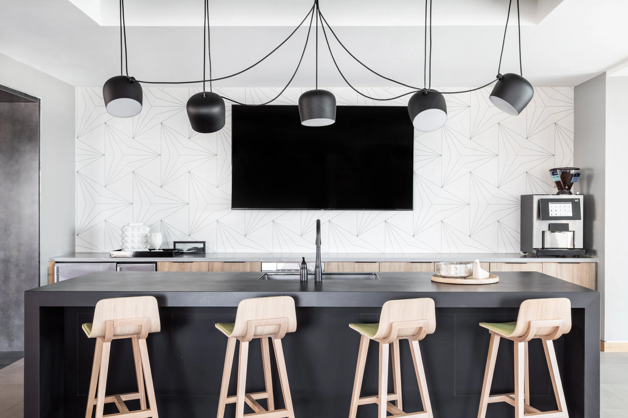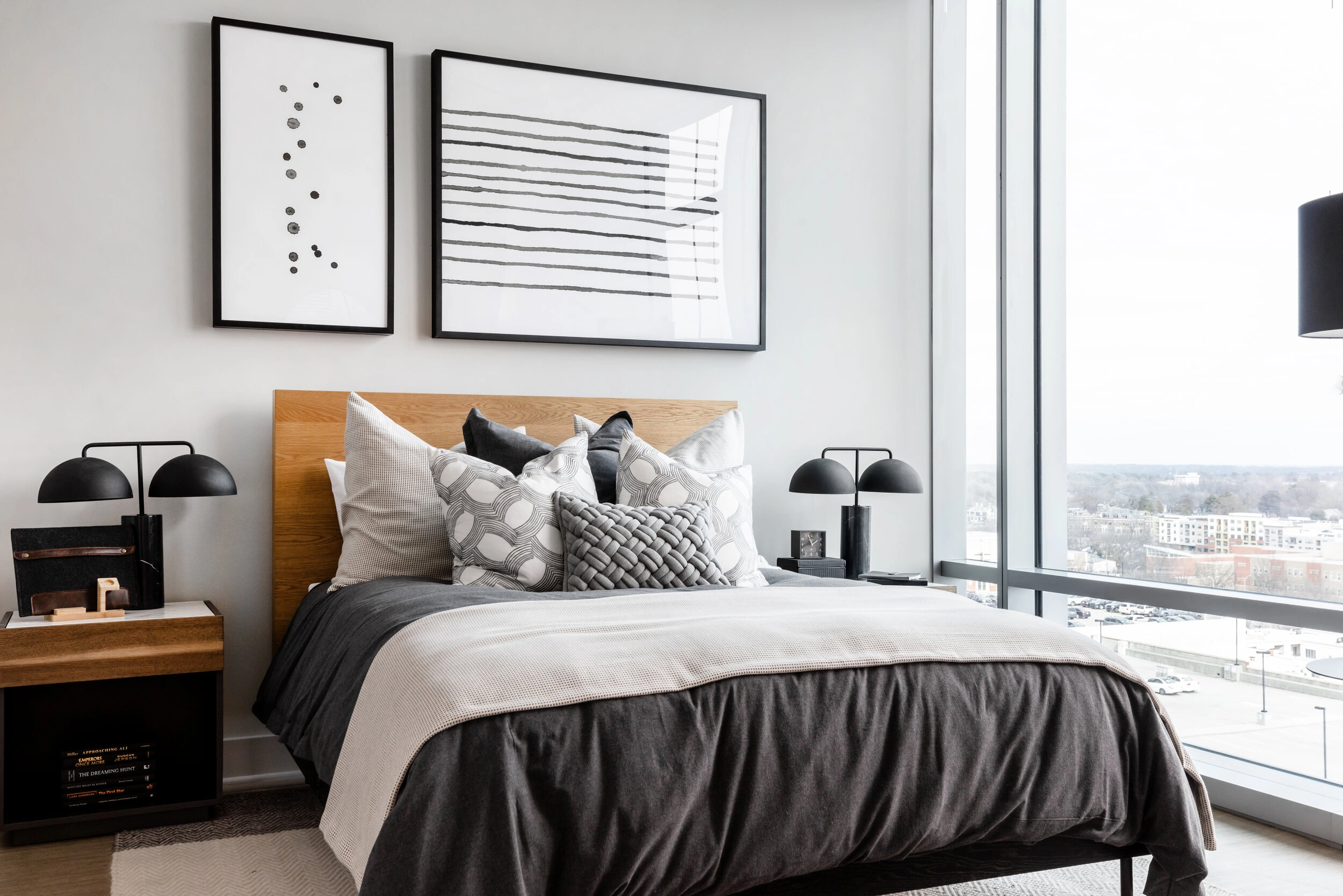 511 Faye is a high-rise luxury apartment community located in FNB Tower in downtown Raleigh, North Carolina. Highlighting the Raleigh skyline and embodying downtown living, the interior of 511 Faye features sleek angles and energetic colors, patterns, and textures to promote a welcoming and dynamic space for residents. The amenities are just as luxurious, featuring a fitness center, yoga studio, and a skydeck with a pool.