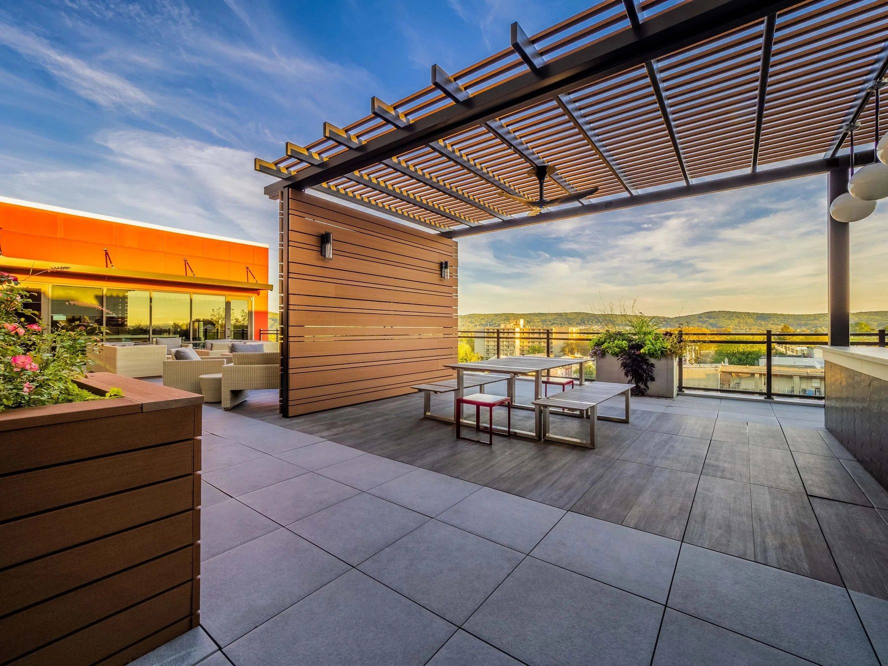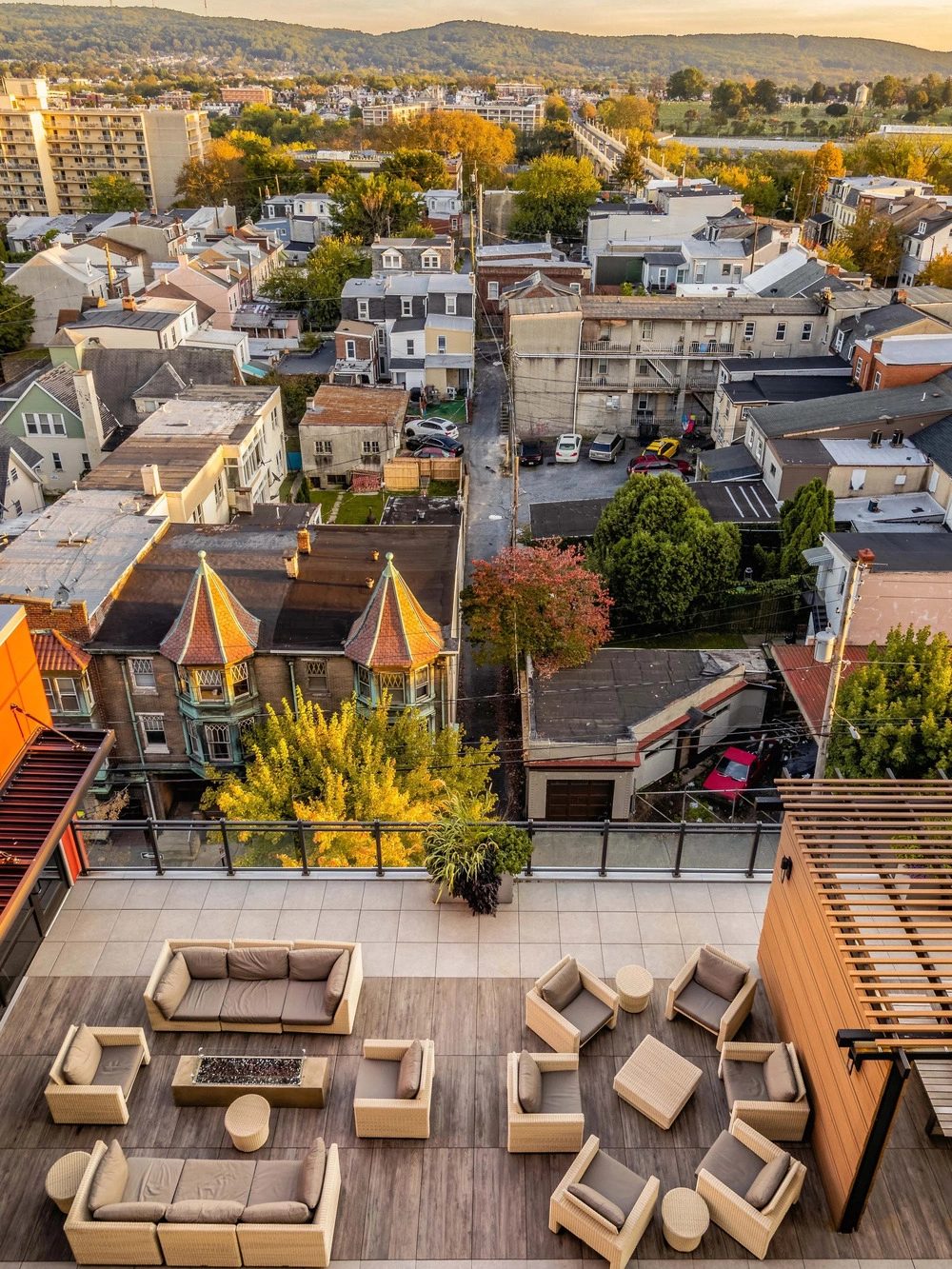 ISG designed Center Square Lofts West to integrate urban living with essential infrastructure. The multifamily residential building wraps and screens a shared parking structure, incorporating the utilitarian element of its core into the overall design. The building’s materials and massing respond to the varied scale of downtown Allentown and reinforce continuity with the surrounding streetscape. The rooftop offers residents an inviting retreat, featuring a fire pit, grilling stations, and lounge seating with views of Allentown.
