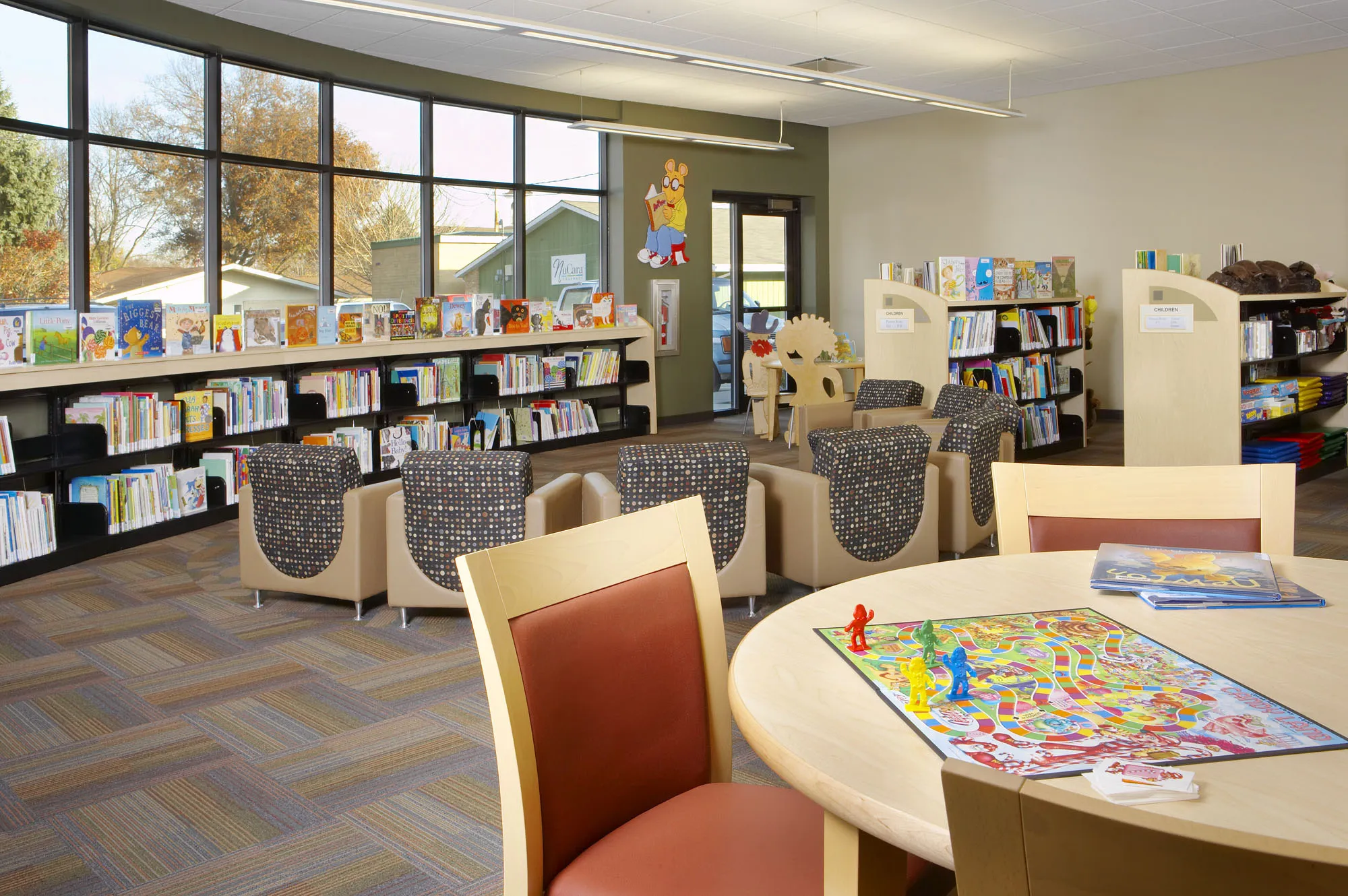 A meeting room, kitchenette, and restrooms can be accessed after hours, and the children’s area has age-appropriately sized furniture, themed to ignite imagination and curiosity. With views of downtown’s Main Street, the library is a cornerstone for the community.