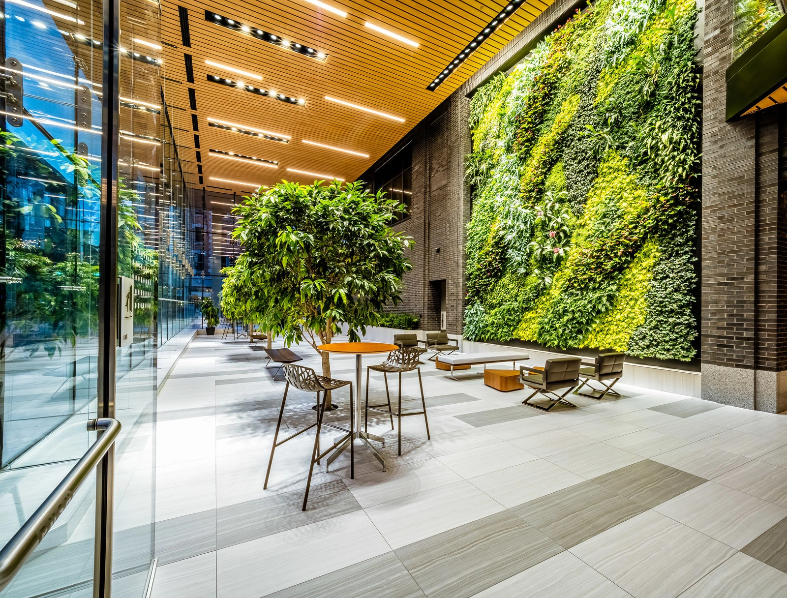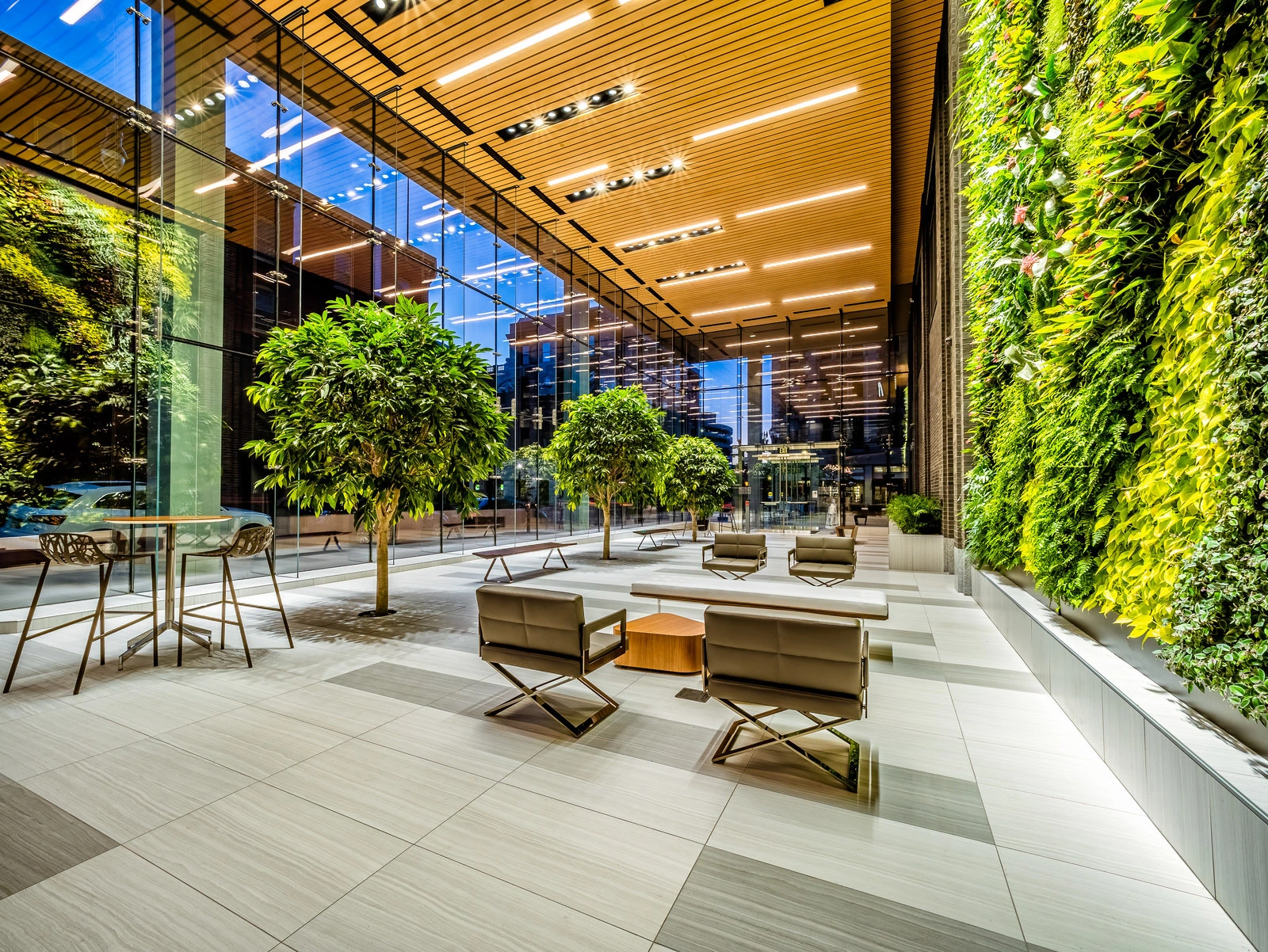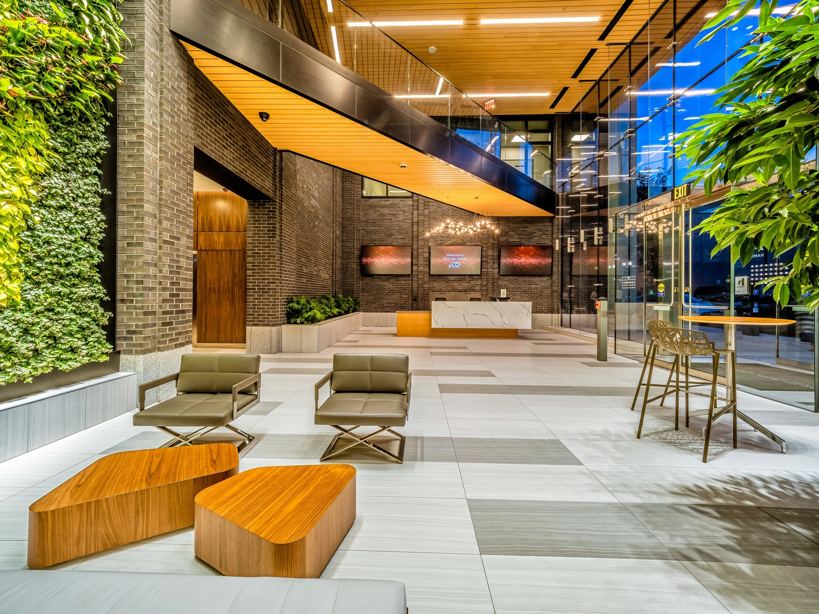 Bringing over 1,200 workers into the downtown area, Five City Center is a 14-story modern office building. The sleek glass facade creates a dynamic presence that complements the surroundings. The lobby features live trees and a 24-foot-tall living wall that contributes to a healthy indoor environment. Five City Center thoughtfully integrates with the surrounding City Center buildings, reinforcing the development’s role as a hub in Allentown.