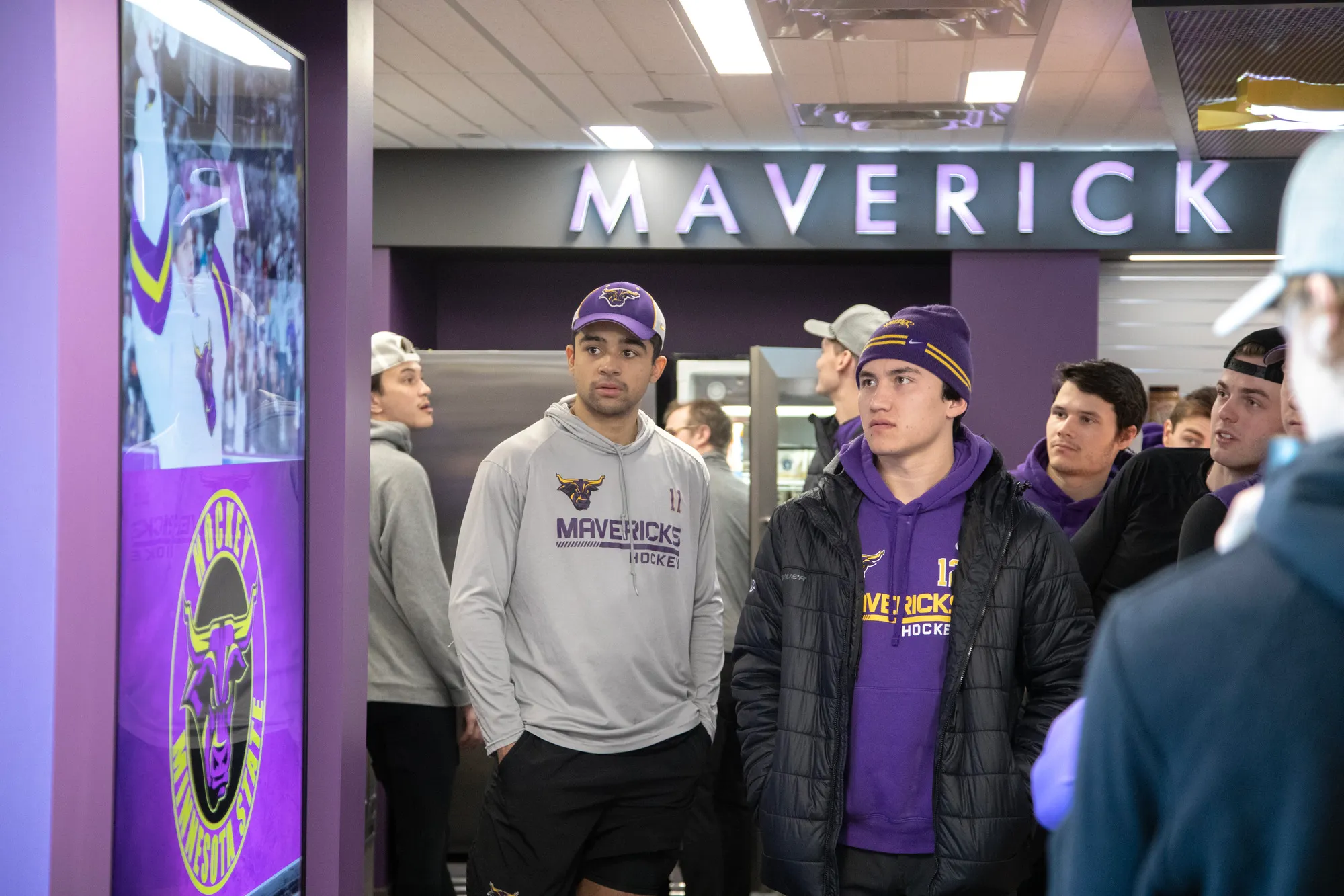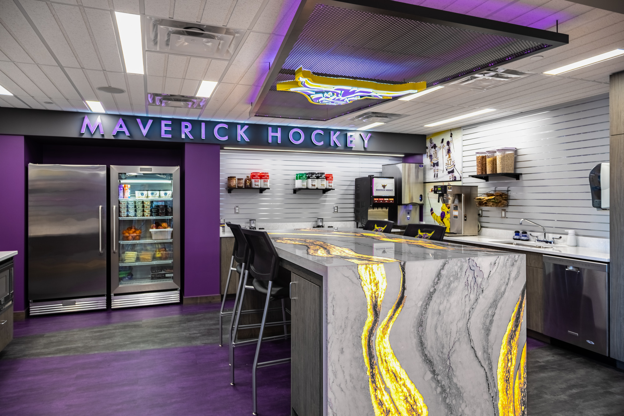 As part of the Minnesota State Mankato Division I Hockey training facility renovation, ISG led the design for a nutrition center with a focus on student athlete well-being. The design included study, relaxation, and recovery areas for players, featuring quartz countertops illuminated in purple and gold and a built-in wall monitor for game day replays. These enhancements bolster recruitment, retention, and development endeavors, attracting top-tier athletes to the championship-level team.