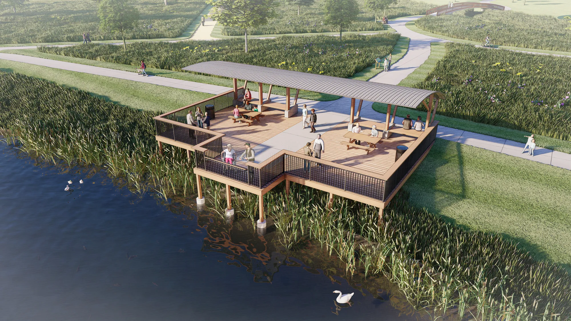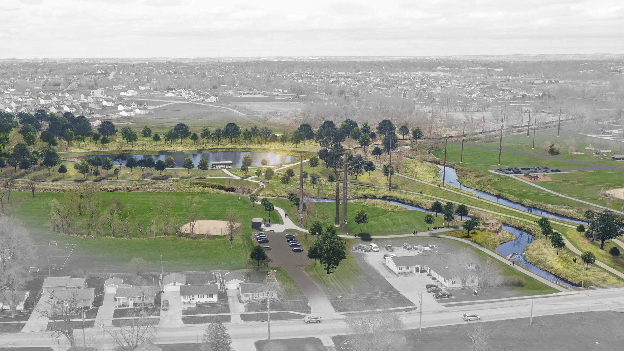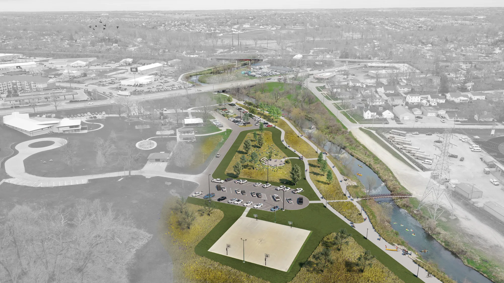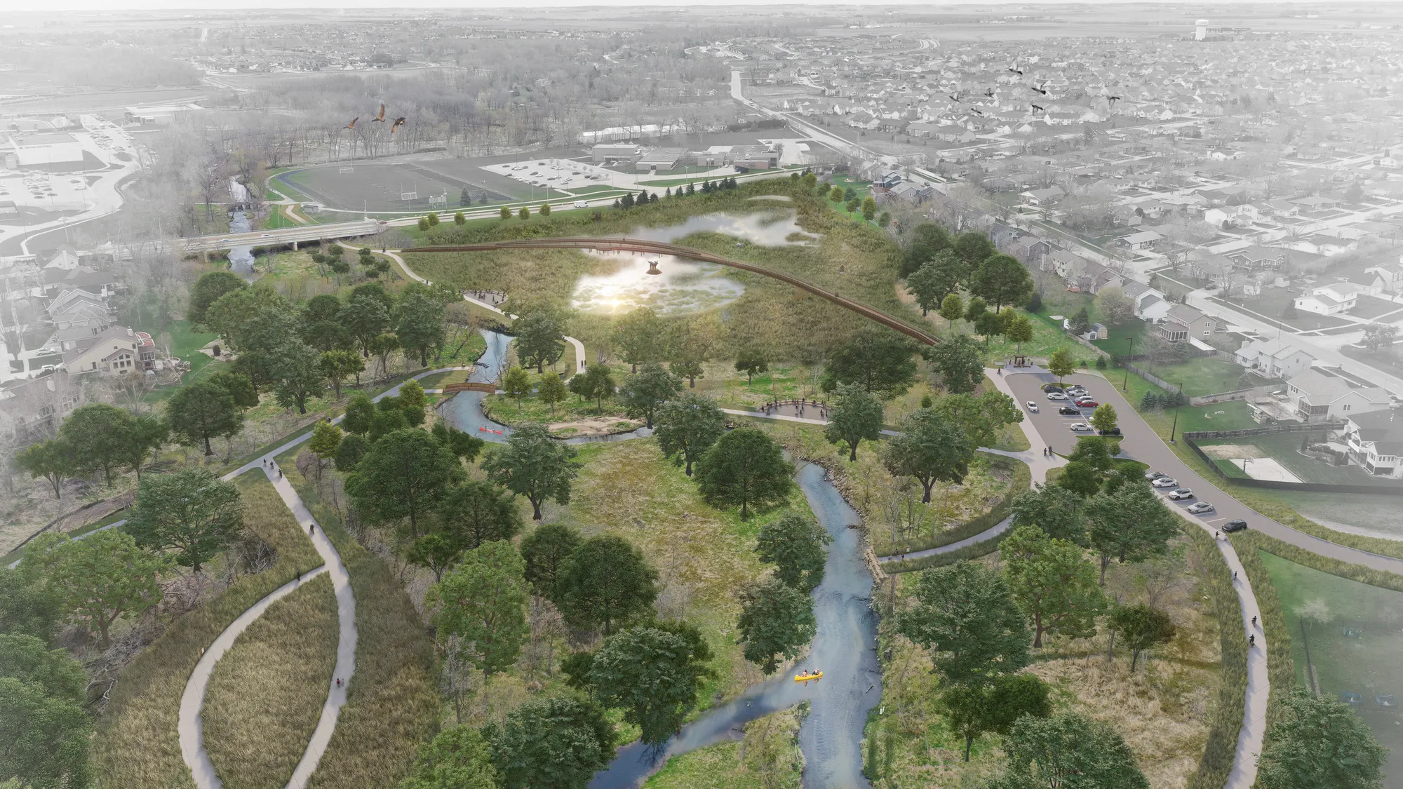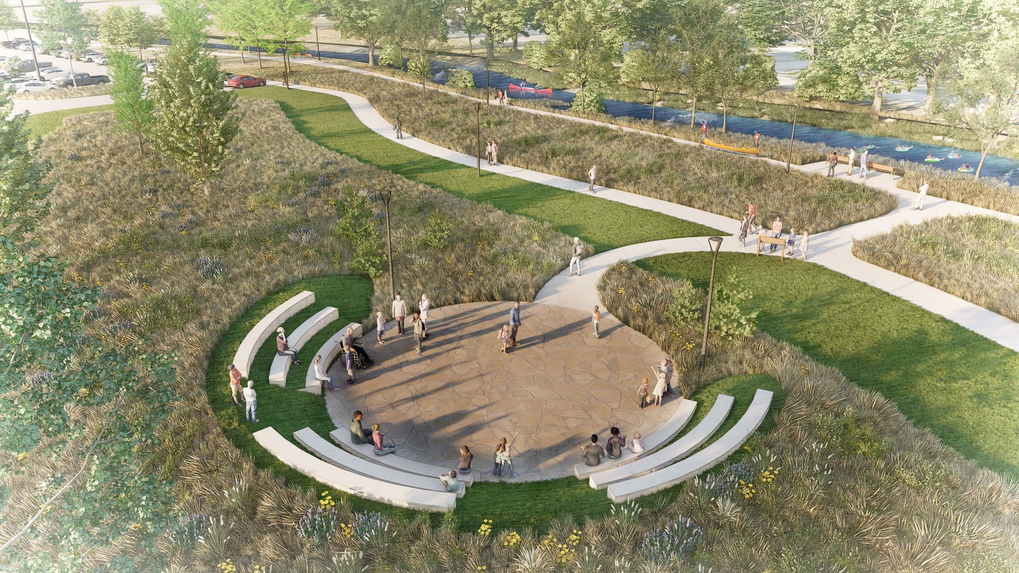 Flowing through Marion, Indian Creek connects communities, neighborhoods, and public spaces. Leveraging Marion's unique geography, ISG collaborated with the Indian Creek Watershed Management Association, the City of Marion, and stakeholders to develop a master plan that builds on this asset, increasing recreation and economic development opportunities. The plan includes river access for watercraft and anglers, along with a soft trail network along the creek. Natural play features, festival spaces, and outdoor learning elements enhance recreational opportunities throughout the corridor. Streambank and habitat restoration, green stormwater infrastructure, and in-stream improvements build momentum around water quality and flood resiliency, helping stakeholders achieve their environmental goals.