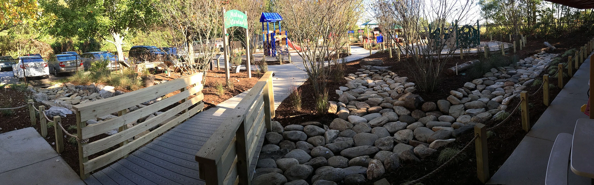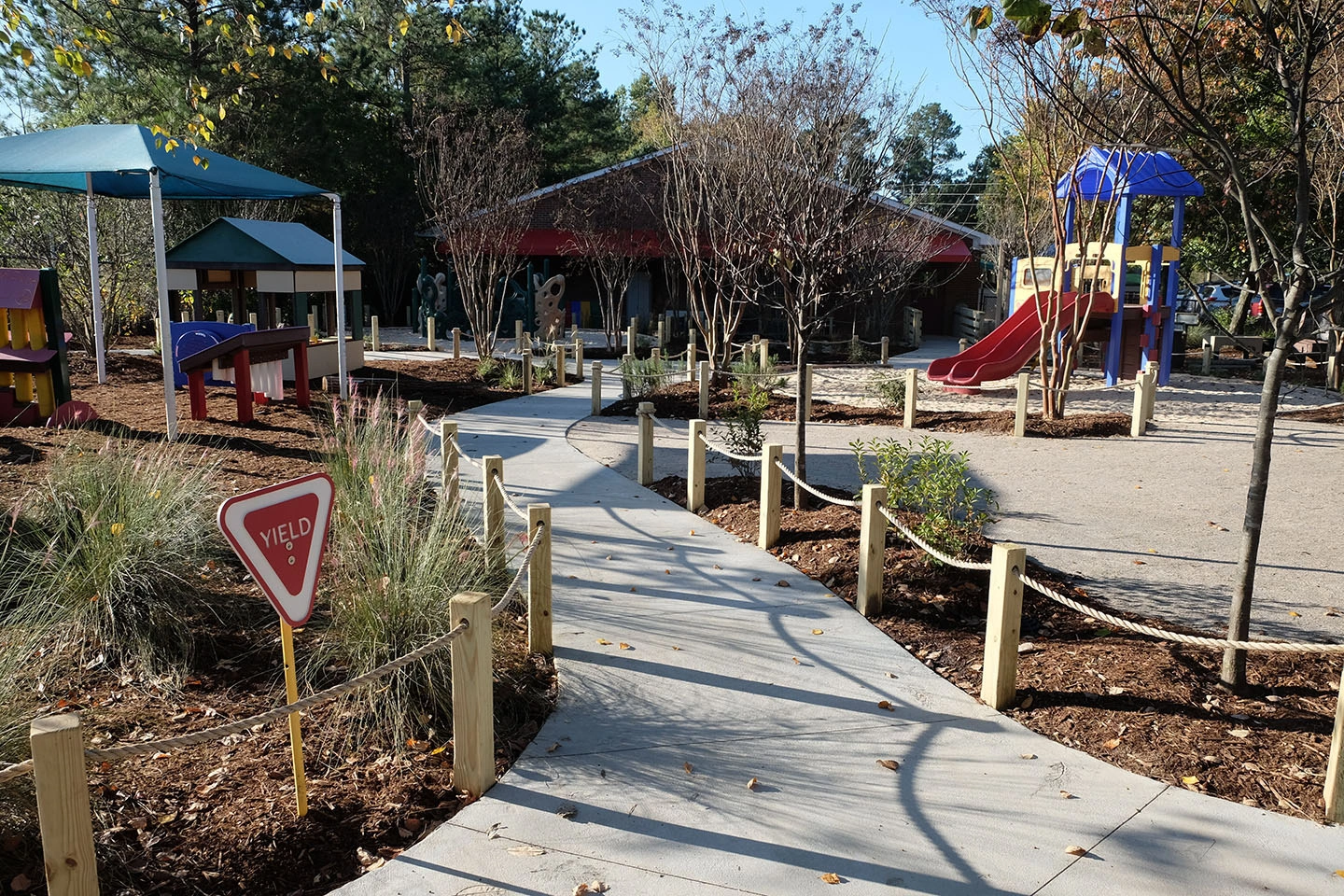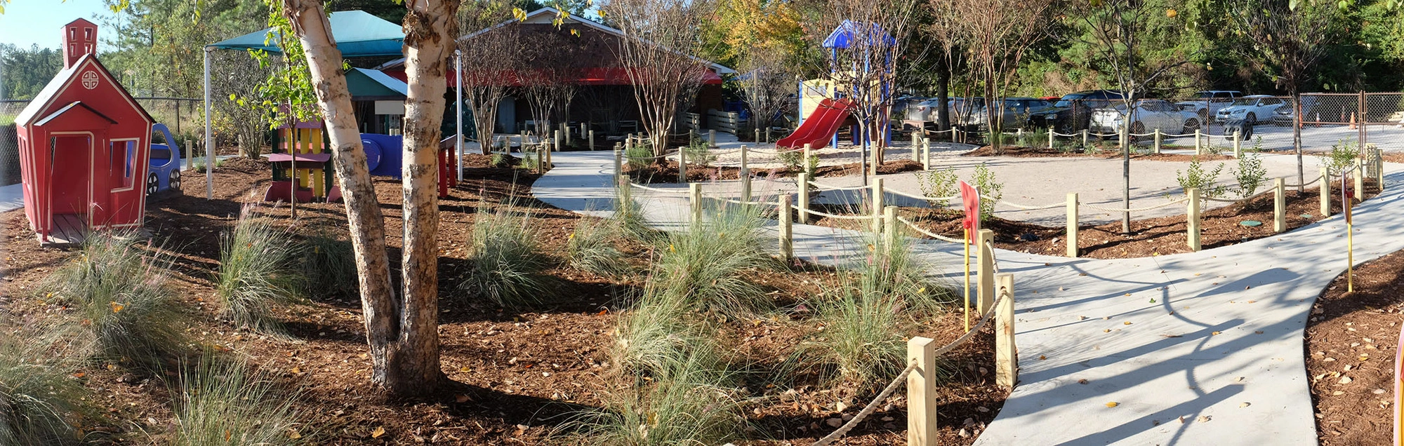 Learning Jungle Durant, a five-star licensed childcare center in Raleigh, partnered with ISG to transform the preschool playground into a naturalized outdoor learning environment. Existing playground equipment was kept in place, and a curvy five-foot-wide path was woven throughout the site. The redesigned space now features playhouses, toy cars, shade structures, a water play area with a hand pump, a grass maze, a central lawn, a trike track, a bridge, and natural elements such as locust balance beams from Wild Child Workshop.