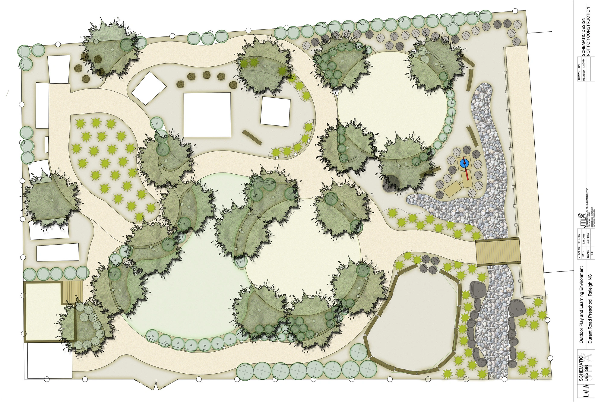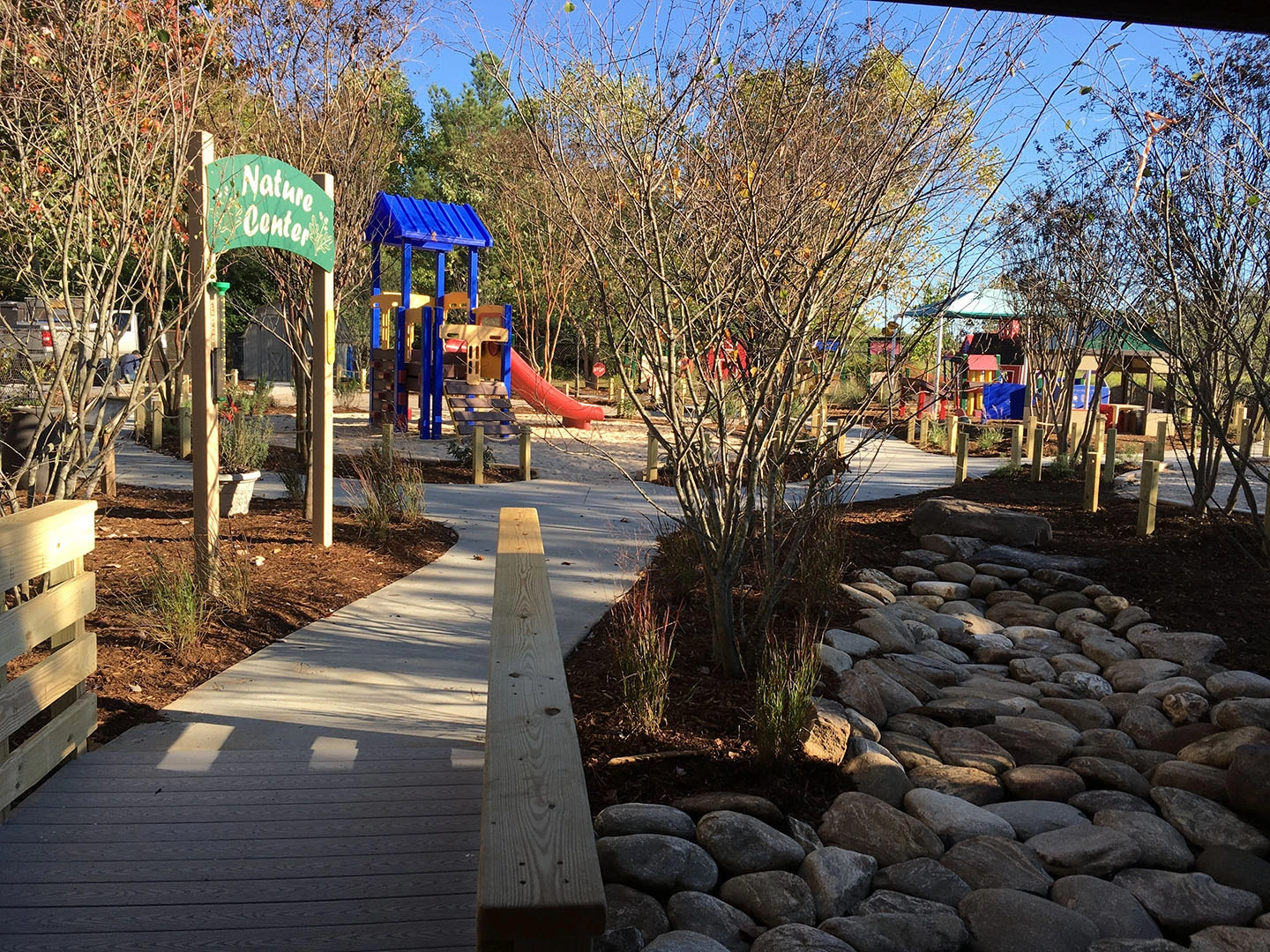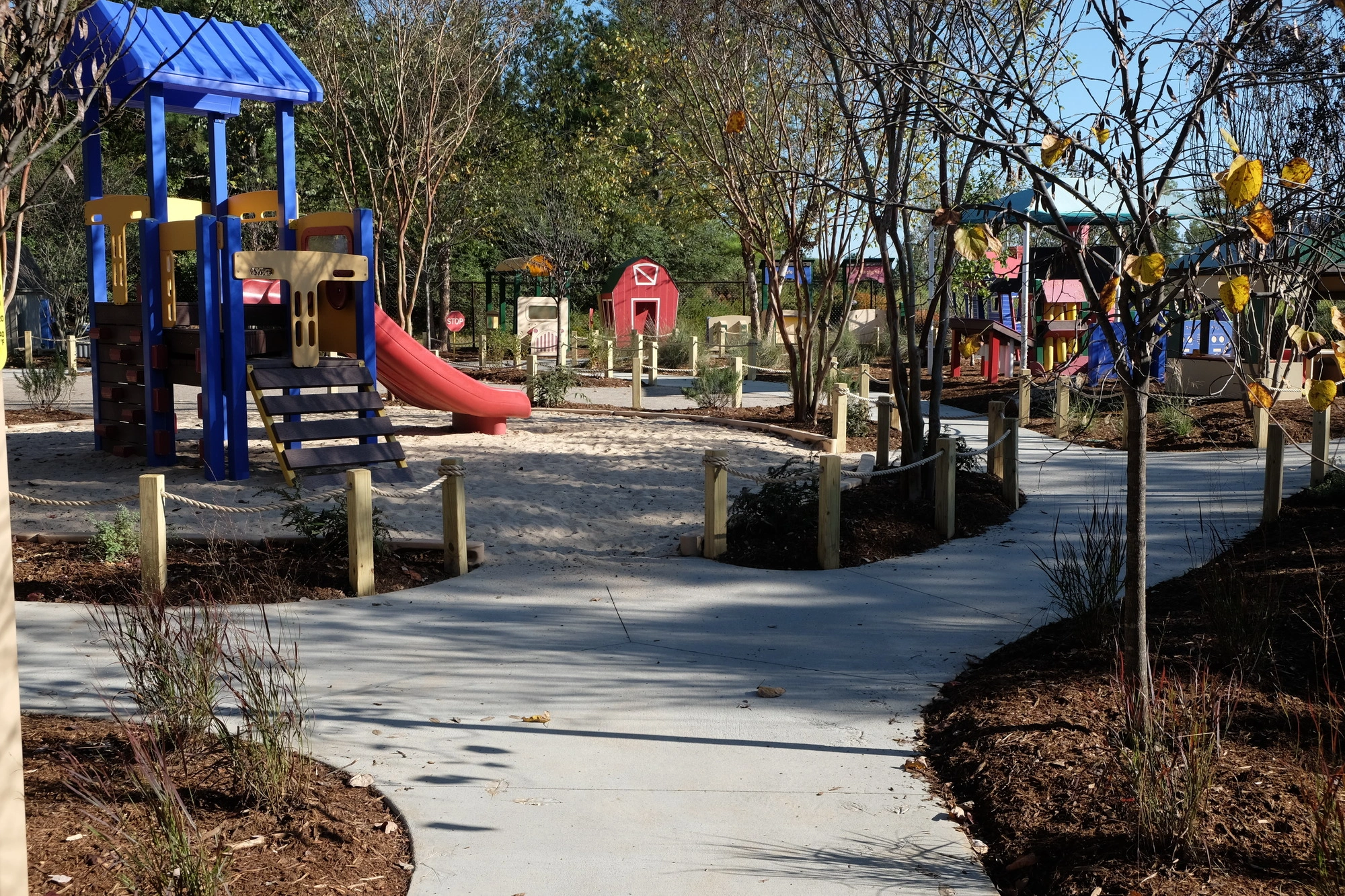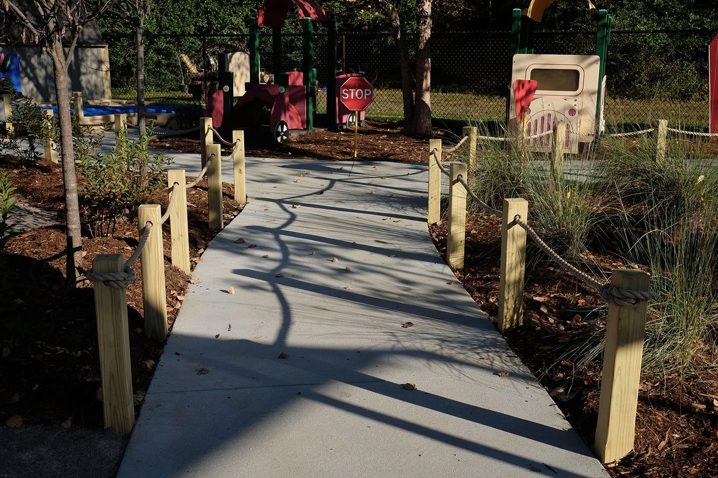 Learning Jungle Durant, a five-star licensed childcare center in Raleigh, partnered with ISG to transform the preschool playground into a naturalized outdoor learning environment. Existing playground equipment was kept in place, and a curvy five-foot-wide path was woven throughout the site. The redesigned space now features playhouses, toy cars, shade structures, a water play area with a hand pump, a grass maze, a central lawn, a trike track, a bridge, and natural elements such as locust balance beams from Wild Child Workshop.