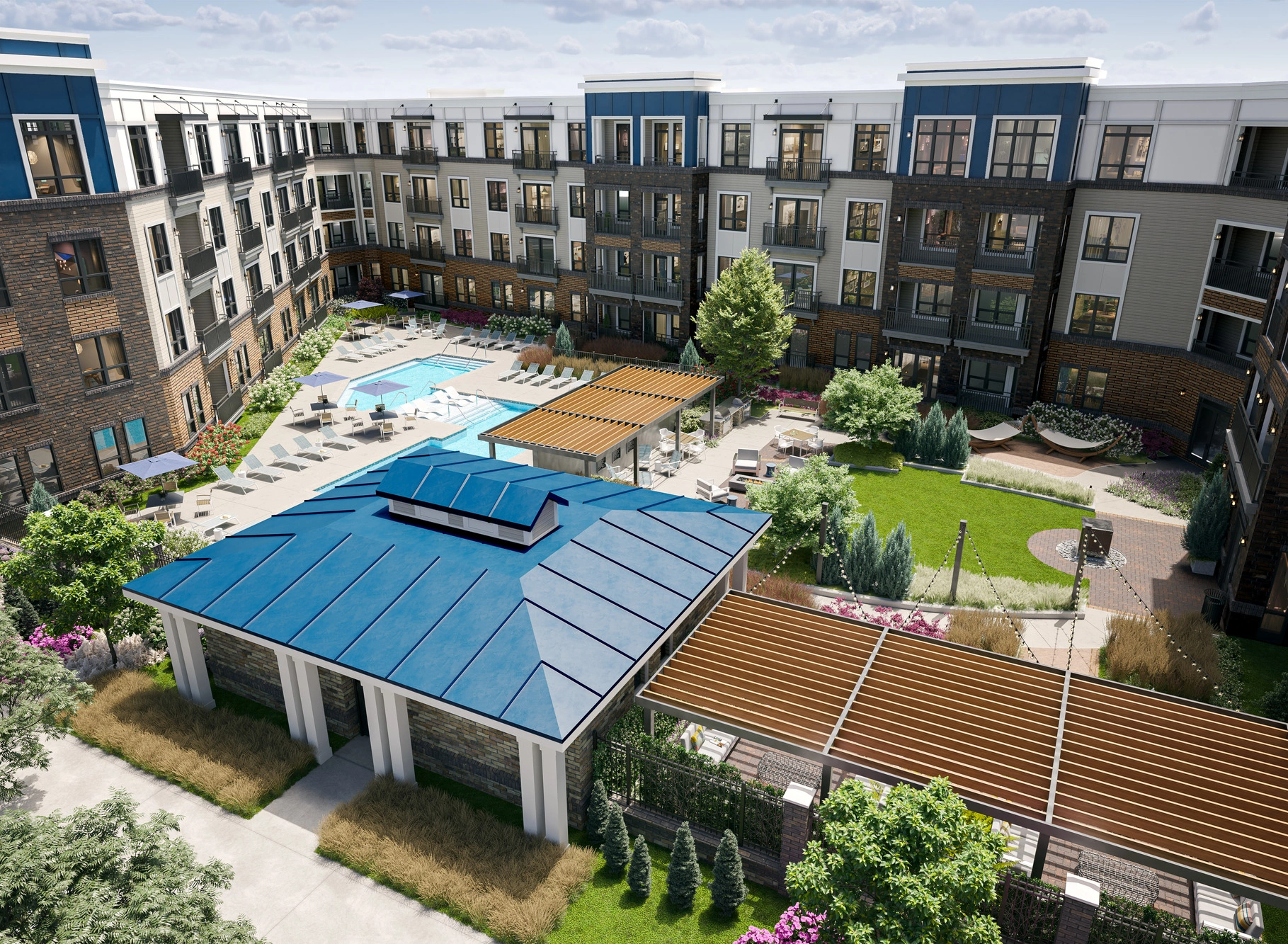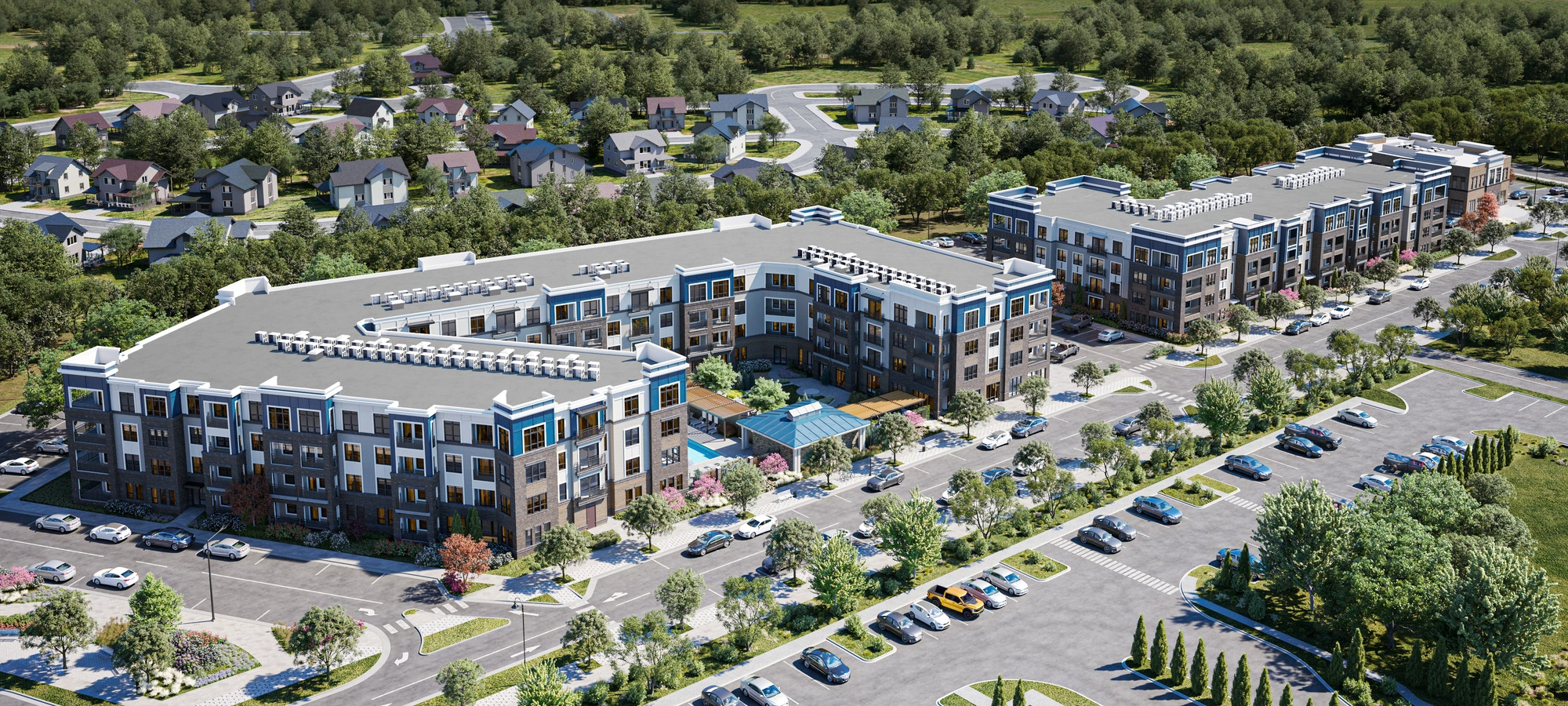 A pair of four-story multifamily buildings anchor this residential community located beside Knightdale Station Park in eastern Raleigh. Thoughtful planning and landscape design create active pedestrian plazas and a tree-lined public streetscape. The architecture transitions from earth-toned stone at the lower floors to light gray with subtle blue accents toward the top of the buildings, creating a cohesive expression that fits within the neighborhood context.
