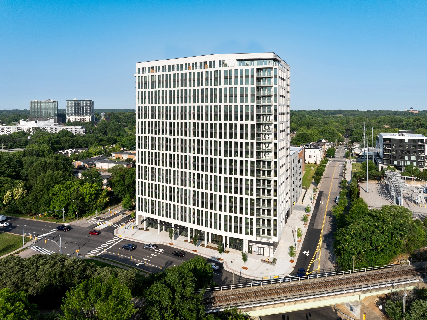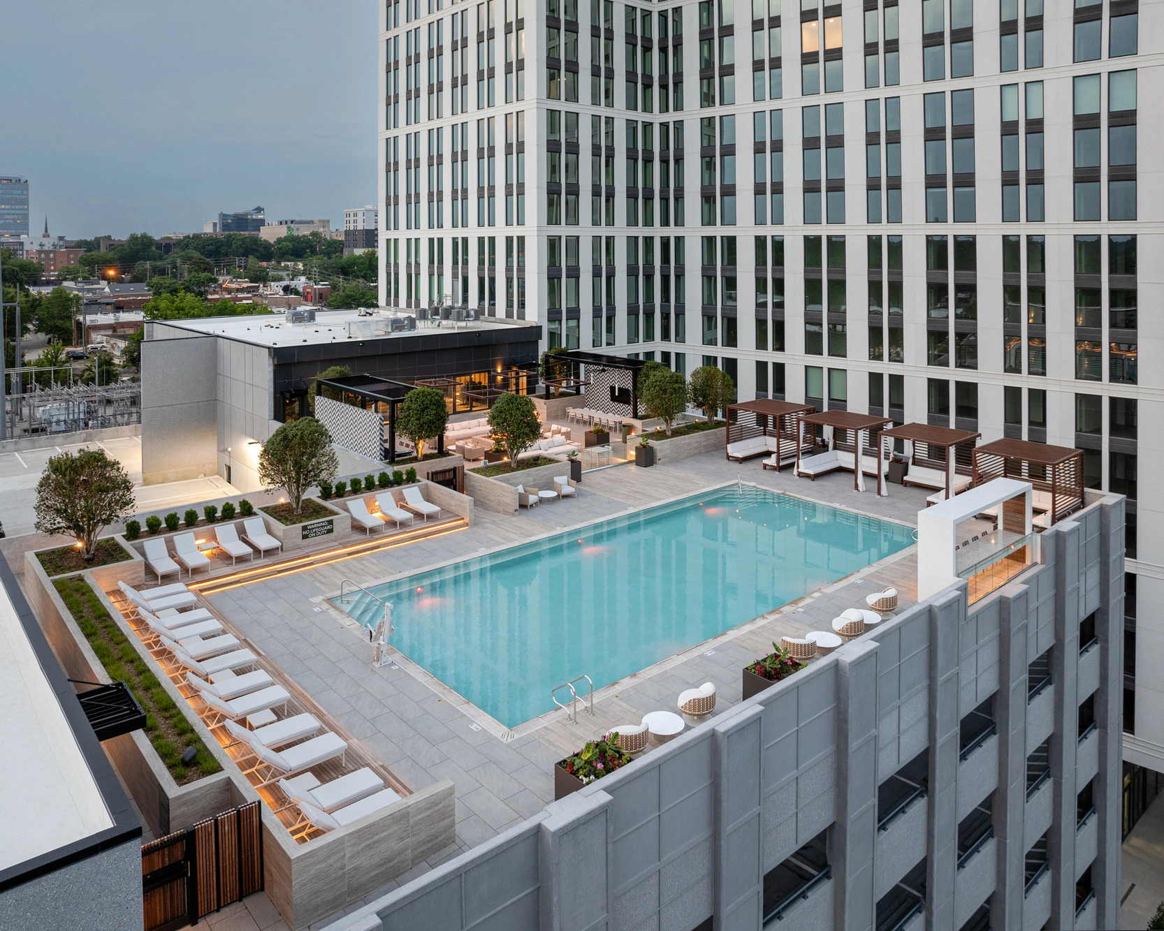 Maeve is a landmark 536,000-square-foot mixed-use development that brings together modern urban living, retail, and public space. The project includes over 10,000 square feet of retail, a publicly accessible pocket park, and a multi-level parking garage. Residents enjoy a suite of amenities such as a 3,500-square-foot fitness club with spa locker rooms, a resort-style pool deck, a sky lounge with views of Downtown Raleigh, a coworking lounge, and a pet spa.