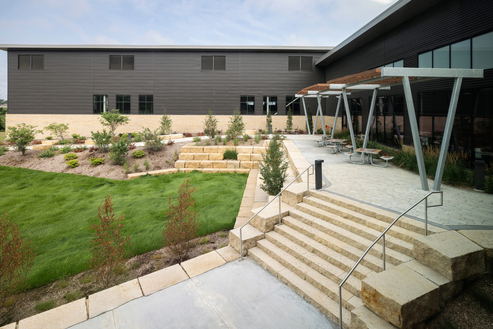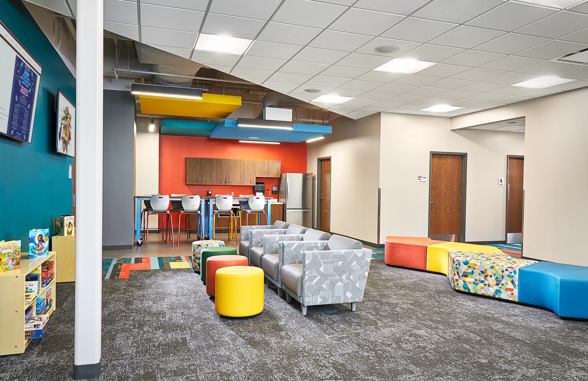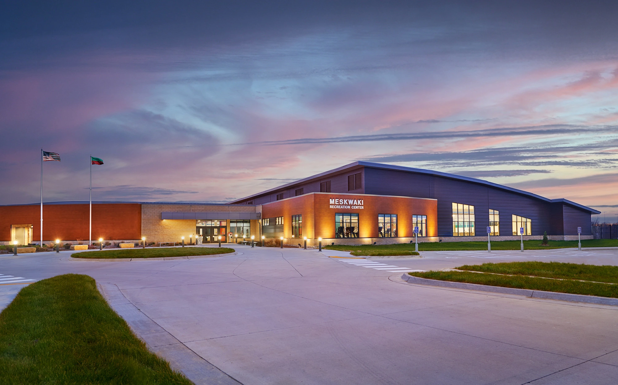 The Meskwaki Nation Recreation Center addresses community needs by delivering a venue that encourages healthy lives, community fellowship, and cultural and historical preservation. The facility includes a fieldhouse, wellness center, indoor walking track, locker rooms, licensed daycare facility, spaces for youth programming, multi-purpose rooms, and teaching kitchens. The outdoor recreation area includes a unique splash pad, 30 feet in diameter.