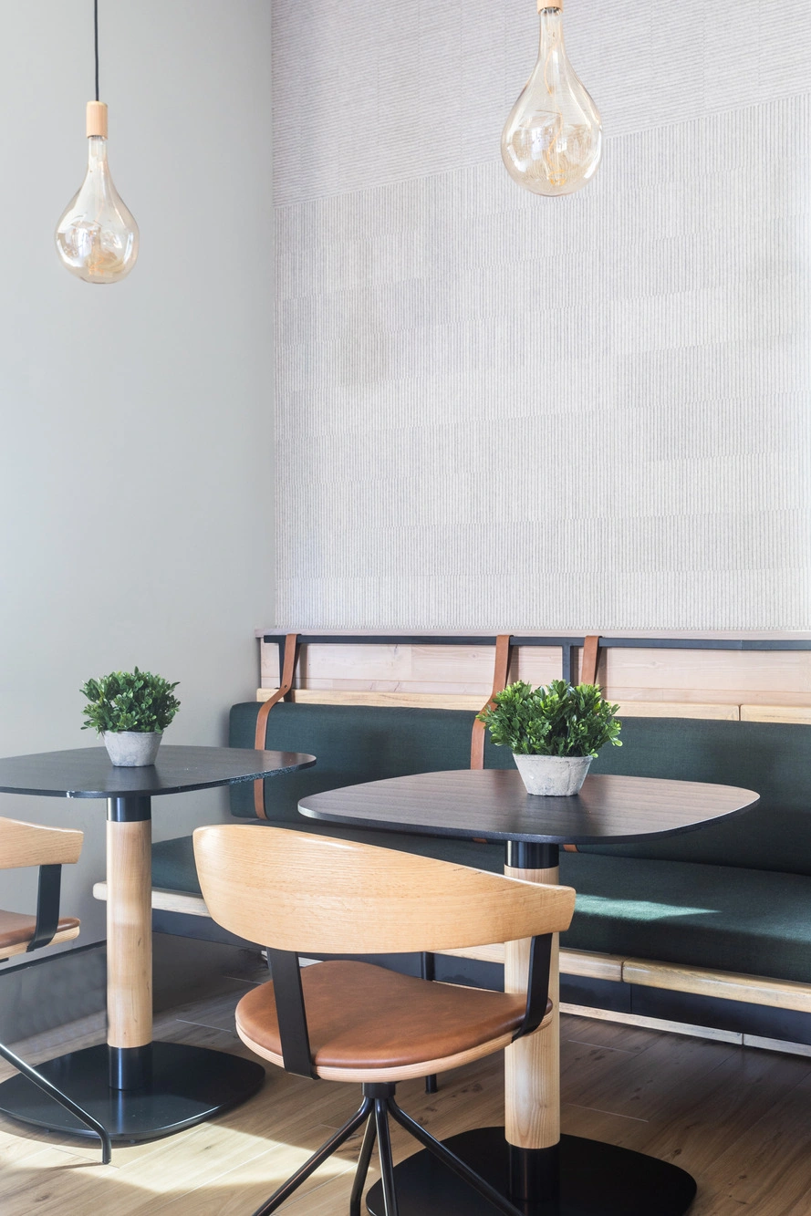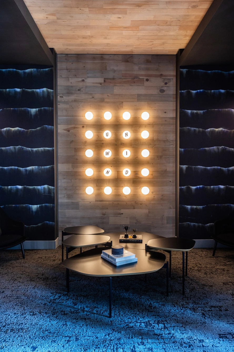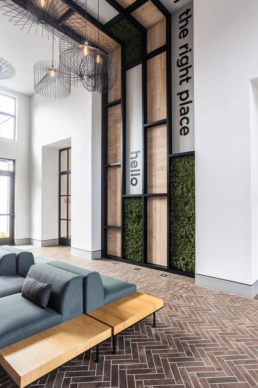 Motiva’s interior design concept establishes an upscale industrial aesthetic with a contemporary edge. Distressed wood, raw black metal, and recycled rubber flooring are balanced with sustainable materials such as glass, leather, and moss. A warm earth-tone palette, factory-inspired lighting, and bold detailing reinforce the authentic warehouse character.