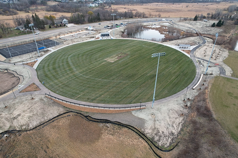 ISG partnered with the City of Plymouth to bring diverse recreation opportunities to the community. The Meadows Playfield design features a multi-use cricket field with a hybrid grass-turf pitch. Parkgoers can also enjoy the new tennis, pickleball, and basketball courts, as well as an ice rink and a Strider bike course. Outdoor enthusiasts can enjoy natural green spaces, including a wetland, native prairie, and pollinator gardens. The community-focused design and thoughtful environmental solutions place The Meadows Playfield at the forefront of the City’s public spaces.